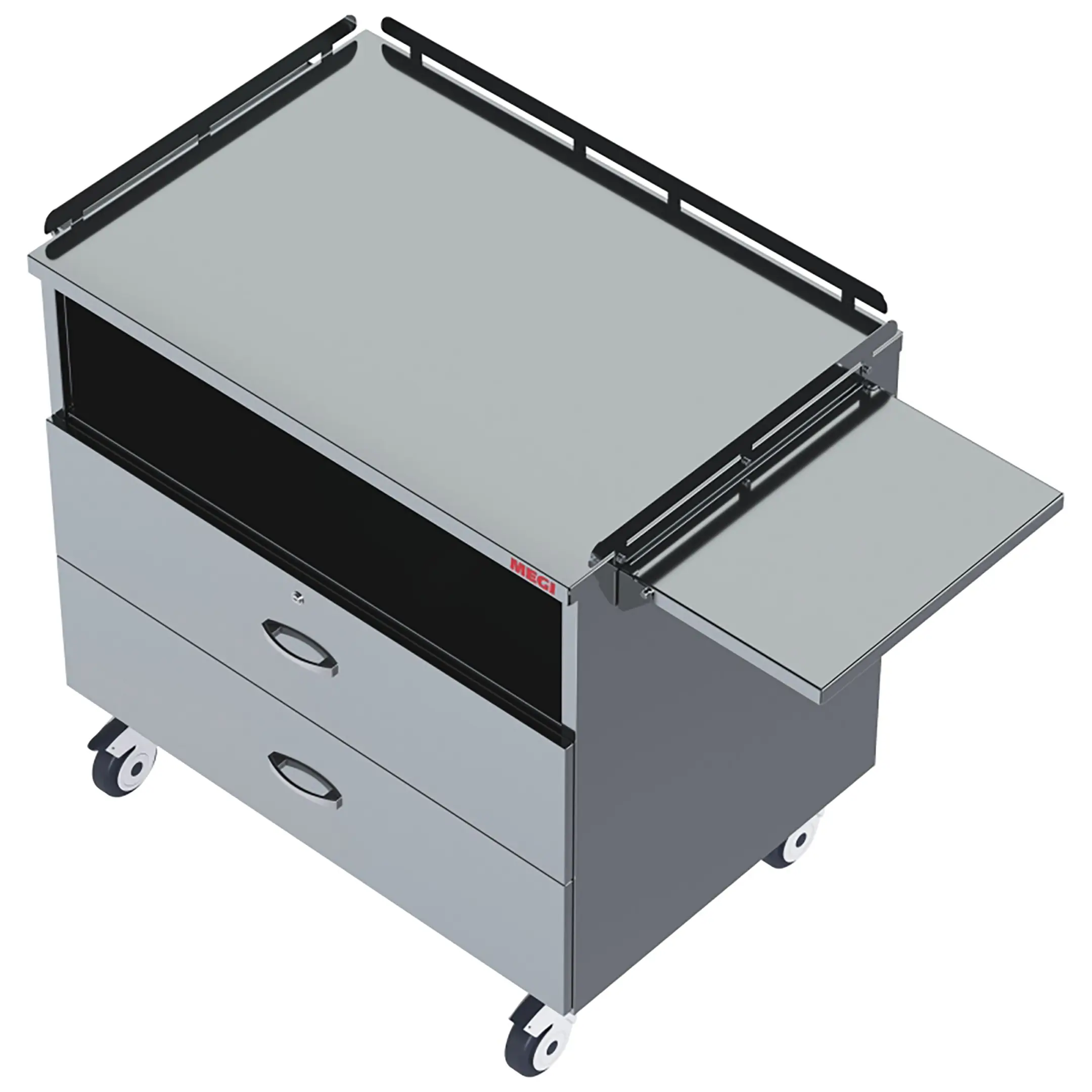 • колеса поворотные, самоориентирующиеся, диаметром 100 мм, комплектуются надёжной стальной вилкой с прецизионным радиально-упорным подшипником, ободом из полипропилена и шинкой из серого полиуретана, не оставляющего следов на полу, два колеса – с индивидуальным тормозным устройством;