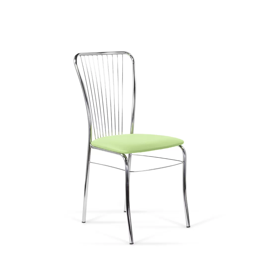 Благодаря оригинальной конструкции спинки, выполненной из тонких металлических стержней, напоминающих натянутые струны, стул выглядит стильно. Каркас выполнен из хрома.