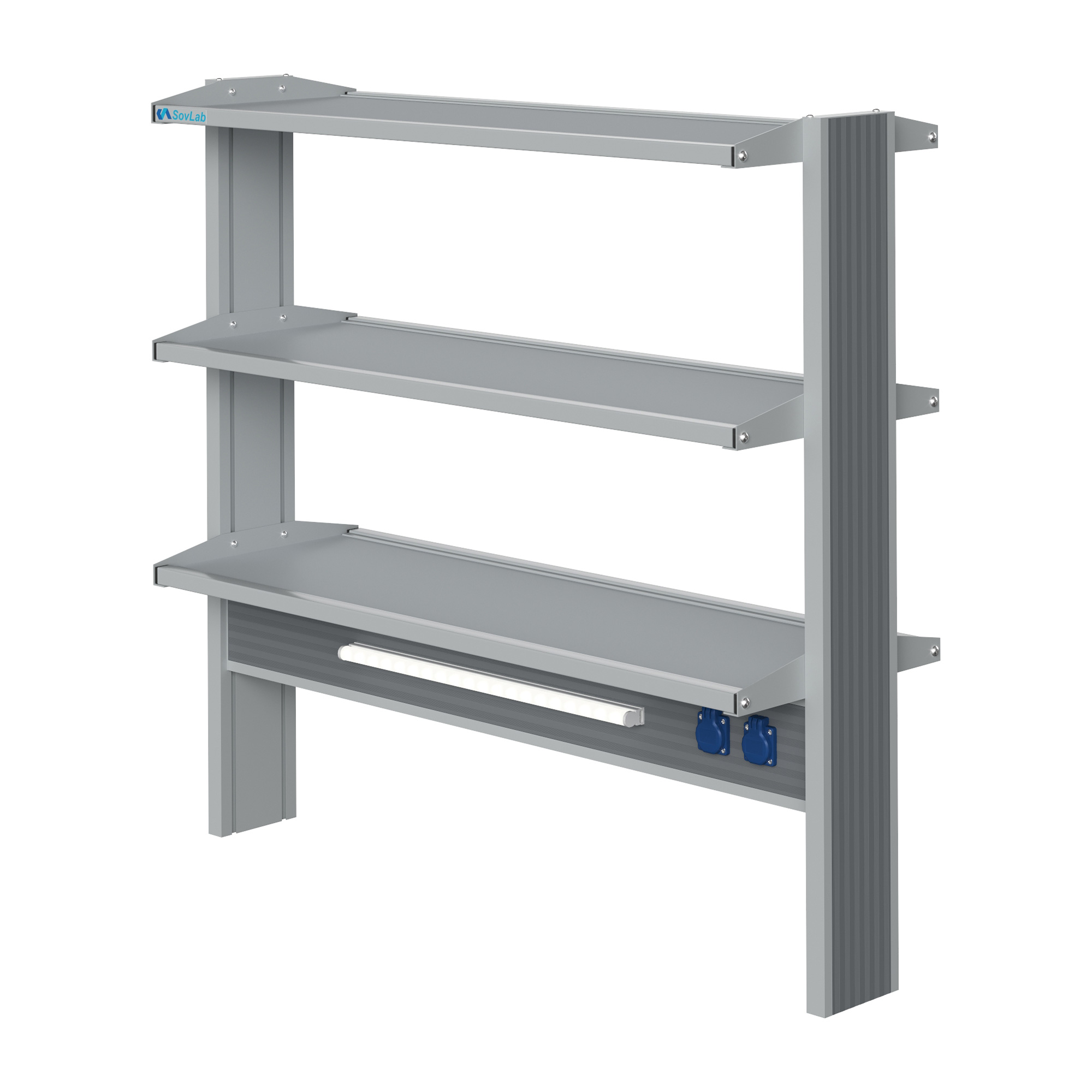 - Вместительная конструкция — три полки глубиной 408 мм позволяют разместить большое количество лабораторного инвентаря и оборудования с двух сторон стеллажа.