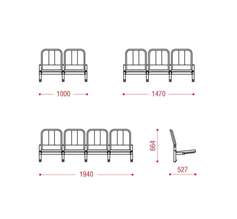 Материал каркаса — трубы сечением 40×40 мм и 20×20 мм, покрытые антикоррозийным полимерно-порошковым составом, обеспечивающим долговременную эксплуатацию. Сиденья и спинки обшиты искусственной кожей, удобной в уходе и устойчивой к повседневному износу. Подпорки регулируются по высоте с помощью подпятников, что позволяет равномерно распределять вес и обеспечивать оптимальное положение относительно пола.