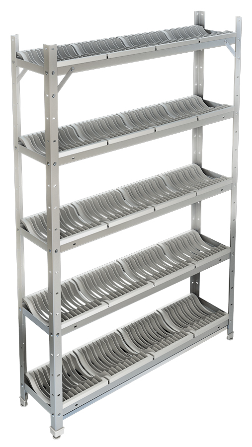 Конструкция стеллажа сборно-разборная, что облегчает транспортировку, сборку и демонтаж. Отсутствие острых элементов делает работу персонала безопасной. Стеллаж оснащен настраиваемыми по высоте ножками.