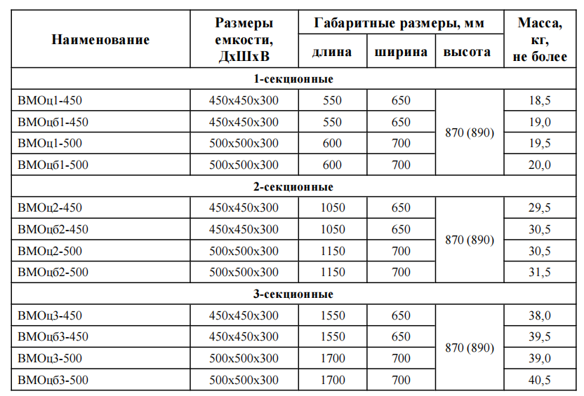 • Ванны могут быть односекционными(ВМОц-1), двухсекционными (ВМОц-2) и трехсекционными (ВМОц-3)