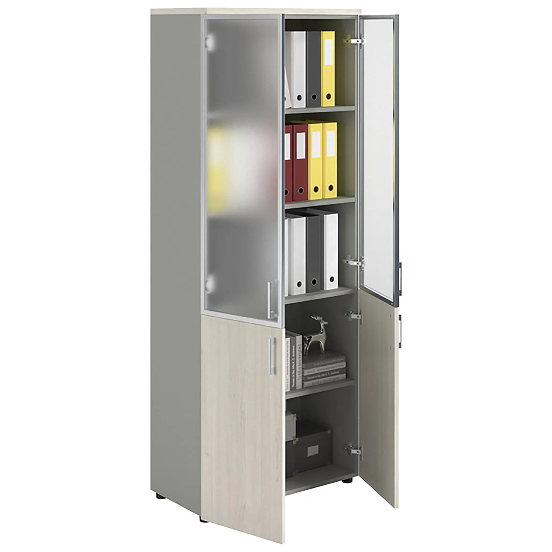 Шкаф NW 2080/2G со стеклом белое дерево/серый предназначен для хранения.