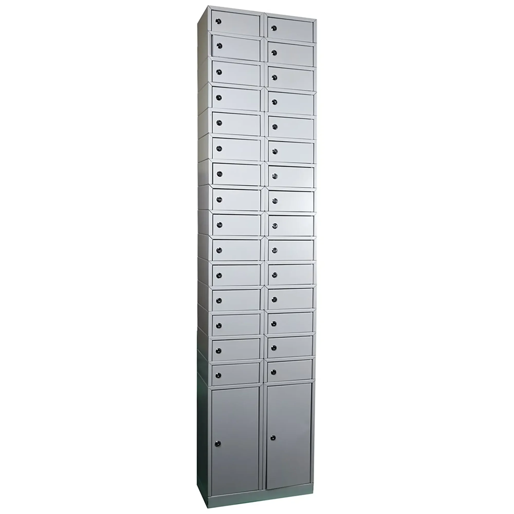 - Большая вместимость и четкая организация — шкаф предоставляет 32 индивидуальные запирающиеся ячейки, что позволяет эффективно хранить мобильные телефоны целого класса, рабочей смены или группы посетителей. Это упорядочивает процесс, исключает хаос и гарантирует, что у каждого устройства есть свое зафиксированное место.