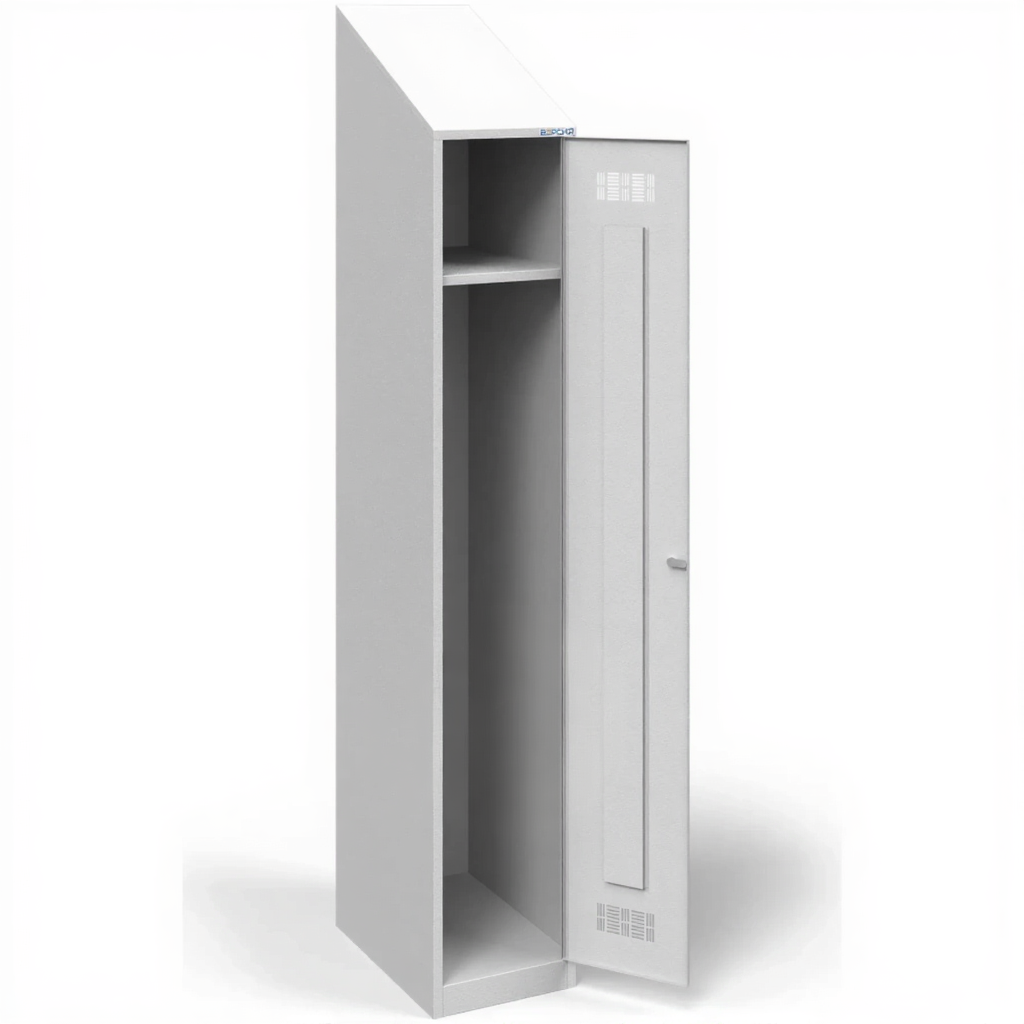 • Шкаф металлический для одежды односекционный с наклонной крышей предназначен для установки в условиях ограниченного пространства.